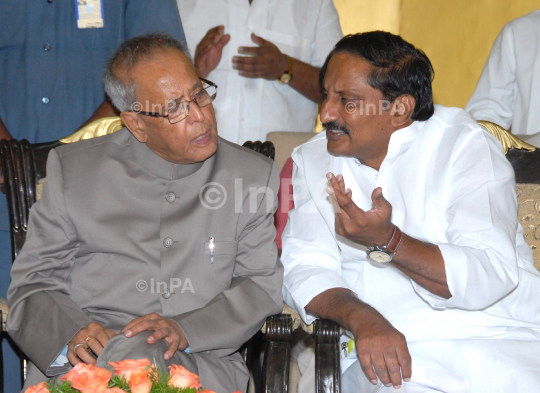UPA nominee for President Pranab Mukherjee with N Kiran Kumar Reddy, Chief Minister of Andhra Pradesh at CLP Meeting at Jubilee Hall in Hyderabad on July, 2012. Photo Credit: Indian Photo Agency