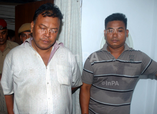 From left Krishna Sankar Das and Bhupesh Das being arrested along a pistol and bullets in the case of a shooting of a business man recently in city at SSP office in Guwahati on Friday 8th June 2012. Photo by Dasarath Deka/Indian Photo Agency