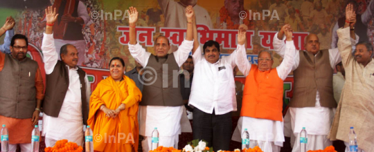 BJP president Nitin Gadkari during Vijay Sankalp Samagam on the occasion of convergence of two Jan Swabhiman Yatras led by Rajnath Singh and Kalraj Mishra respectively at Ayodhya in Uttar Pradesh on 17/11/2011. Vinay Katiyar, Mukhtar Abbas Naqvi, Uma Bharti,Surya Pratap Shahi are also in the picture. Photo by Shashibhushan Pandey/Indian Photo Agency