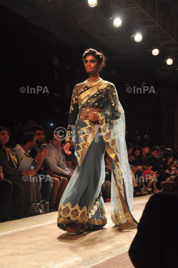 Model walks the ramp for designer Anju Modi at Lakme Fashion Week. in Mumbai, India on August 21, 2014. Photo by Indian Photo Agency (InPA)