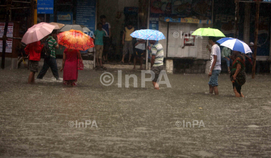 Men walk through a flooded railway track after heavy rains in Mumbai, India, Monday, Aug. 29, 2011. Train services were disrupted due to water logging in the tracks in several low-lying areas in the city. Photo by Sachin Halde/Indian Photo Agency