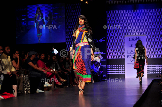 A model walks the ramp to display designer Anita Dongre's creation "Global Desi" during the Lakme Fashion Week Winter/ Festive 2013 in Mumbai, India on August 24, 2013. Photo Credit: Indian Photo Agency (InPA)