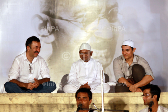 India's anti-corruption activist Anna Hazare, centre, with Bollywood actor Aamir Khan and Director Rajkumar Hirani during the 12th day of Hazare's fast against corruption in New Delhi, India, Saturday, Aug. 27, 2011. Finance Minister Pranab Mukherjee warned lawmakers Saturday not to bypass India's constitution as they seek to resolve an impasse with Hazare who has demanded that they pass an anti-corruption bill. Photo Credit: Indian Photo Agency