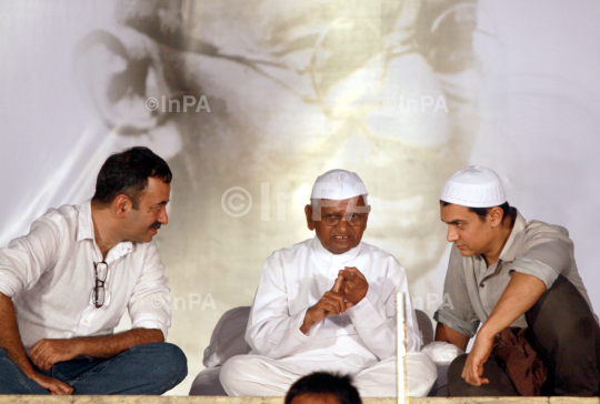 India's anti-corruption activist Anna Hazare, centre, with Bollywood actor Aamir Khan and Director Rajkumar Hirani during the 12th day of Hazare's fast against corruption in New Delhi, India, Saturday, Aug. 27, 2011. Finance Minister Pranab Mukherjee warned lawmakers Saturday not to bypass India's constitution as they seek to resolve an impasse with Hazare who has demanded that they pass an anti-corruption bill. Photo Credit: Indian Photo Agency