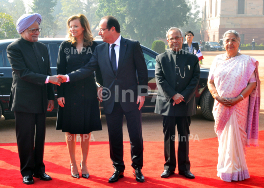 Indian President, Pranab Mukherjee and the Prime Minister, Dr Manmohan Singh with the President of the Republic of France, Francois Hollande at his Ceremonial Reception, at Rashtrapati Bhavan, in New Delhi on February 14, 2013.