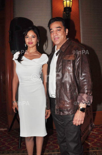 Bollywood actor Kamal Hassan with actress Pooja Kumar during a press conference for film 'Vishwaroop' to telecast the premiere of the movie Vishwaroopam on PPV (Pay per View) mode in Mumbai, India on Jan 04, 2013. Photo Credit: Indian Photo Agency