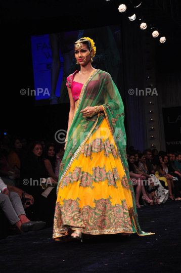 A model displays creation by fashion designer Neeta Lulla during the Lakme Fashion Week 2012 Winter/Festive, in Mumbai, India on August 7, 2012. Photo Credit: Indian Photo Agency
