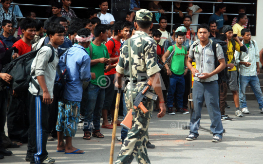A security personnel keeps a vigil in front of Students and youth from the North East after they arrived at Guwahati Railway Station through a special train from Bangalore for the fear of their life due to ethnic violence, in Guwahati, Assam on Saturday 18th August 2012. Photo by Dasarath Deka/Indian Photo Agency
