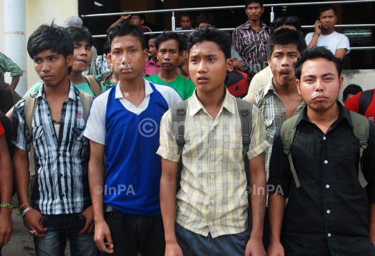 Youth and students from North East state reach Guwahati Railway Station in a special train from Bangalore under tight security for the fear of their life due to ethnic violence in Guwahati on Saturday 18th August 2012. The government on Friday banned bulk SMS and MMS messages for 15 days in view of the exodus of people from the northeast from cities like Bangalore, Pune and Hyderabad following rumors that they would be attacked. Photo by Dasarath Deka/Indian Photo Agency