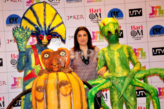 Bollywood actress and choreographer Farah Khan with the aliens during the promotion of her upcoming film "Joker" in Mumbai on August 24, 2012. Photo Credit: Indian Photo Agency