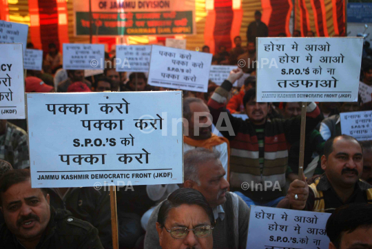 Jammu Kashmir Democratic Front during a protest in support of their demands of demands that the SPO's should be regularized in the state police in front of Press Club of Jammu in Jammu and Kashmir on 16/12/2011. Photo by Amit Sharma/Indian Photo Agency
