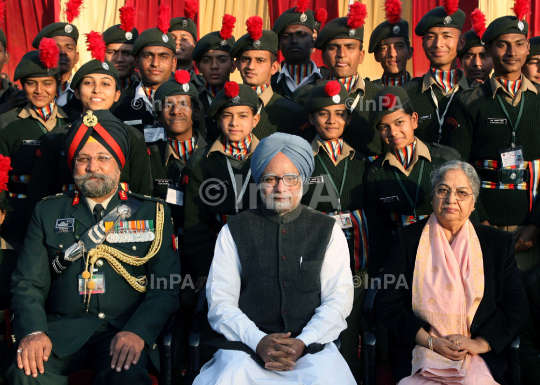 Indian Prime Minister, Dr Manmohan Singh and his wife Gursharan Kaur with the NCC cadets participating in the Republic Day celebrations, in New Delhi on January 24, 2012. DG NCC, Lt. Gen. PS Bhalla is also seen. Photo Credit: Indian Photo Agency