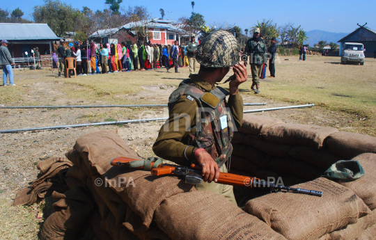 An Indian security personnel stand guard as voters stand in queue to cast their vote during the 60th Manipur Assembly election at Shajouba, under Senapati district of the Indian eastern state of Manipur on Saturday, January 28, 2012. 279 candidates are on fray for the 60 seat Manipur assembly constituencies. At least 7 persons were killed during polling day violence in Manipur, according to local news agency. Photo by Caisii Mao/Indian Photo Agency