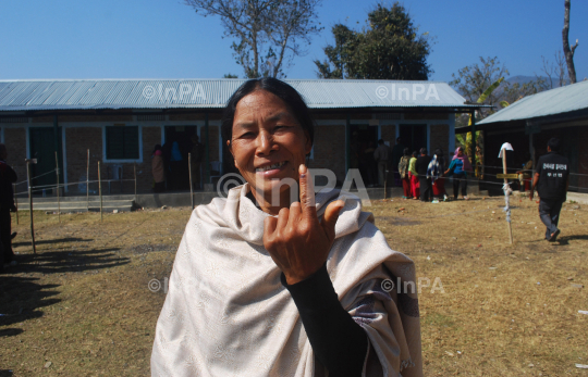 A women voters show her ink mark after casting her vote during the 60th Manipur Assembly election at Shajouba, under Senapati district of the Indian eastern state of Manipur on Saturday, January 28, 2012. 279 candidates are on fray for the 60 seat Manipur assembly constituencies. At least 7 persons were killed during polling day violence in Manipur, according to local news agency. Photo by Caisii Mao/Indian Photo Agency