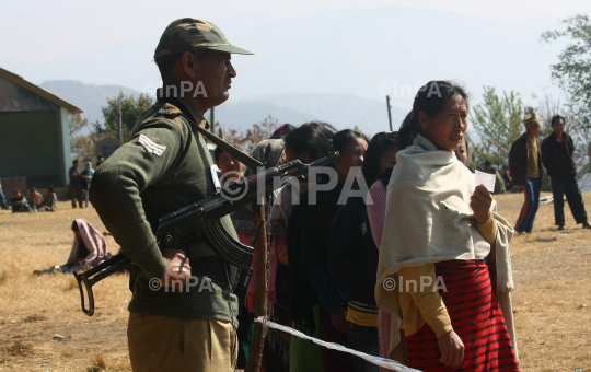 An Indian security personnel stand guard as voters stand in queue to cast their vote during the 60th Manipur Assembly election at Shajouba, under Senapati district of the Indian eastern state of Manipur on Saturday, January 28, 2012. 279 candidates are on fray for the 60 seat Manipur assembly constituencies. At least 7 persons were killed during polling day violence in Manipur, according to local news agency. Photo by Caisii Mao/Indian Photo Agency