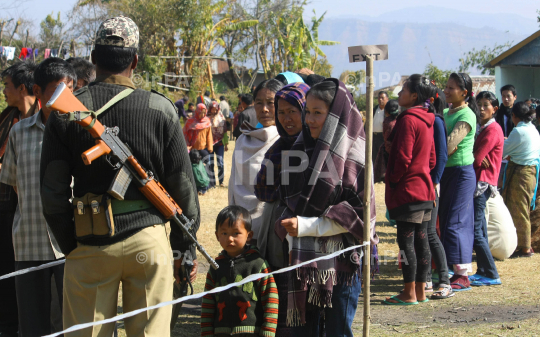 An Indian security personnel stand guard as voters stand in queue to cast their vote during the 60th Manipur Assembly election at Shajouba, under Senapati district of the Indian eastern state of Manipur on Saturday, January 28, 2012. 279 candidates are on fray for the 60 seat Manipur assembly constituencies. At least 7 persons were killed during polling day violence in Manipur, according to local news agency. Photo by Caisii Mao/Indian Photo Agency