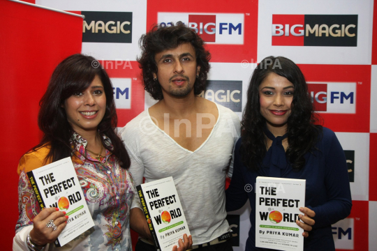 Singer and musician Sonu Nigam with Teesha Nigam (Sonu Nigamís sister) and Priya Kumar during launch of Priya Kumarís latest inspirational book ëThe Perfect World " A Journey to Infinite Possibilities" on 92.7 BIG FM in Mumbai on Tuesday, 31 January 2012. Photo Credit: Indian Photo Agency