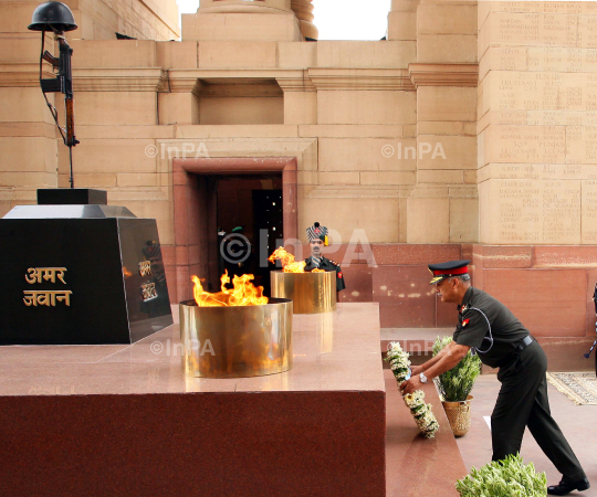 Additional Directorate General of Army Education and Colonel Commandant AEC, Maj. Gen. Pranab Chakraborty paying homage on the occasion of the 65th Raising Day of the Army Educational Corps (AEC), at Amar Jawan Jyoti, Indian Gate in New Delhi on June 1, 2012. Photo Credit: Indian Photo Agency