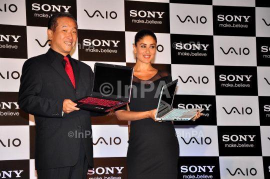 Sony India Brand Ambassdor and bollywood actress Kareena Kapoor with Masaru Tamagawa, Managing Director, Sony India Pvt. Ltd. during Launch of new rang of VAIO venture Ultrabooks in Mumbai, on 6 June 2012. Photo Credit: Indian Photo Agency
