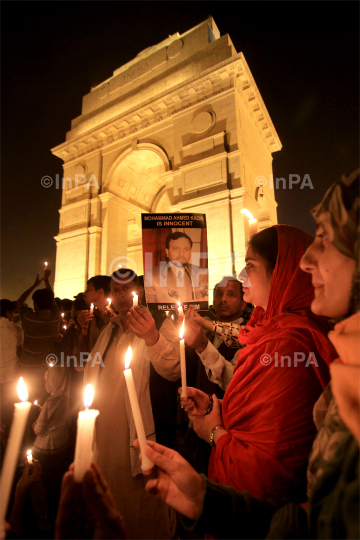 Journalists, friends and family members of Sayed Mohammed Ahmed Kazmi, during a candle light vigil at India Gate for his release in New Delhi, India, Monday, March 12, 2012. Kazmi, a senior journalist, was held by police for his alleged role in facilitating the February 13 bombing of an Israeli diplomat's car. Photo Credit: Indian Photo Agency
