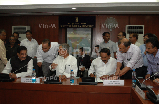 Chief Minister of Maharashtra, Prithviraj Chavan and the Chief Minister, Andhra Pradesh, N Kiran Kumar Reddy signing an MoU between Andhra Pradesh and Maharashtra on Dr. BR Ambedkar Pranhita-Chevelia Project, in the presence of Union Minister for Parliamentary Affairs and Water Resources, Shri Pawan Kumar Bansal, in New Delhi on May 05, 2012. Photo Credit: Indian Photo Agency