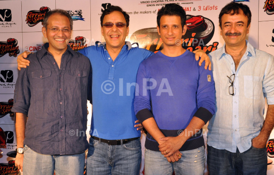 Bollywood Director Rajesh Mapuskar, Vidhu Vinod Chopra, actor Sharman Joshi and director Rajkumar Hirani during the unveiling of song of film Ferrari Ki Sawaari in Mumbai on Tuesday, 08 May 2012. Photo Credit: Indian Photo Agency