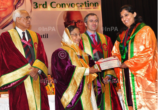 President Pratibha Patil with Jammu and Kashmir chief minister Omar Abdulla and Governor NN Vohra at the convocation of Shri Mata Vaishno Devi University at Jammu in Jammu and Kashmir on 25/11/2011. Photo by Amit Sharma/Indian Photo Agency