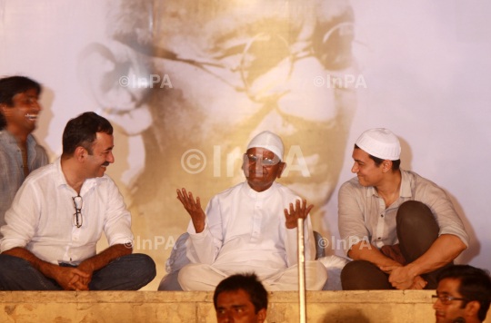 India's anti-corruption activist Anna Hazare, centre, with Bollywood actor Aamir Khan and Director Rajkumar Hirani during the 12th day of Hazare's fast against corruption in New Delhi, India, Saturday, Aug. 27, 2011. Finance Minister Pranab Mukherjee warned lawmakers Saturday not to bypass India's constitution as they seek to resolve an impasse with Hazare who has demanded that they pass an anti-corruption bill. Photo Credit: Indian Photo Agency