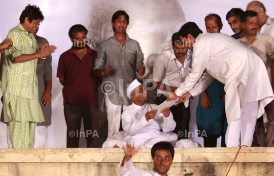 Congress party leader Vilasrao Deshmukh hands over a letter written by the Indian Prime Minister Manmohan Singh to India's anti-corruption activist Anna Hazare, seated center, with assurance that both houses of Parliament passed a resolution supporting three points raised by him on the 12th day of his hunger strike against corruption in New Delhi, India, Saturday, Aug. 27, 2011. India's Parliament expressed nonbinding support for a series of anti-corruption proposals on Saturday in the hopes that would be enough to persuade the reform activist to end his hunger strike. Photo Credit: Indian Photo Agency