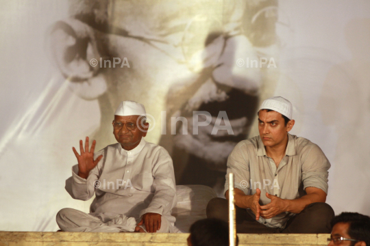 India's anti-corruption activist Anna Hazare with Bollywood actor Aamir Khan during the 12th day of Hazare's fast against corruption in New Delhi, India, Saturday, Aug. 27, 2011. Photo Credit: Indian Photo Agency