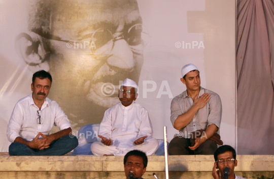 India's anti-corruption activist Anna Hazare, centre, with Bollywood actor Aamir Khan and Director Rajkumar Hirani during the 12th day of Hazare's fast against corruption in New Delhi, India, Saturday, Aug. 27, 2011. Finance Minister Pranab Mukherjee warned lawmakers Saturday not to bypass India's constitution as they seek to resolve an impasse with Hazare who has demanded that they pass an anti-corruption bill. Photo Credit: Indian Photo Agency