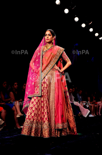 A model displays creation by fashion designer Neeta Lulla during the Lakme Fashion Week 2012 Winter/Festive, in Mumbai, India on August 7, 2012. Photo Credit: Indian Photo Agency