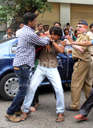 A MNS activist beats RPI activist in presence of a policeman during a peaceful protest of Republican Party of India against Raj Thackeray, Chief Maharashtra Navnirman Sena (MNS) at Shivaji Park in Mumbai, India on August 23, 2012. Photo by Sachin Halde/Indian Photo Agency
