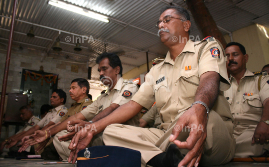 Mumbai police personnel Meditating to " Traffic Control ", a stress elimination program to help reducing stress levels during Platinum Jubilee Celebrations of the Prajapita Brahma Kumari in Mumbai on 8 December 2011. Photo by Sachin Halde/Indian Photo Agency