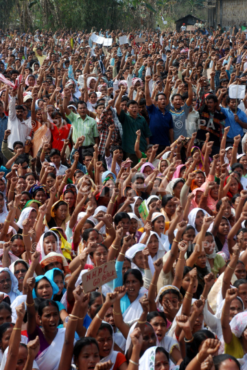 Anti dam protestors taking slogans by raising on hand during the public meeting against the construction of Lower subansiri Hydro electric project at Sauldhoia, Lakhimpur, Assam on Thursday 23rd February 2012. Photo by Gitika Talukdar/Indian Photo Agency