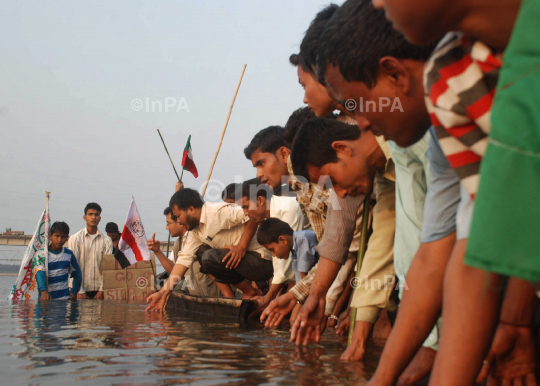 Anti dam protestors with along with Akhil Gogoi secretary of Krisak mukti Sangram Samiti taking promise by touching the water of subansiri rivers to save the river as a part of protest against the construction of Lower subansiri Hydro electric project at Sauldhoia, Lakhimpur, Assam on Thursday 23rd February 2012. Photo by Gitika Talukdar/Indian Photo Agency