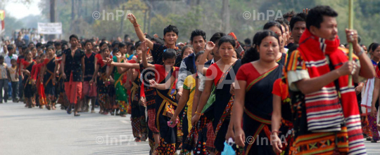 Anti dam protestors coming to take part in the public meeting against the construction of Lower subansiri Hydro electric project at Sauldhoia, Lakhimpur, Assam on Thursday 23rd February 2012. Photo by Gitika Talukdar/Indian Photo Agency