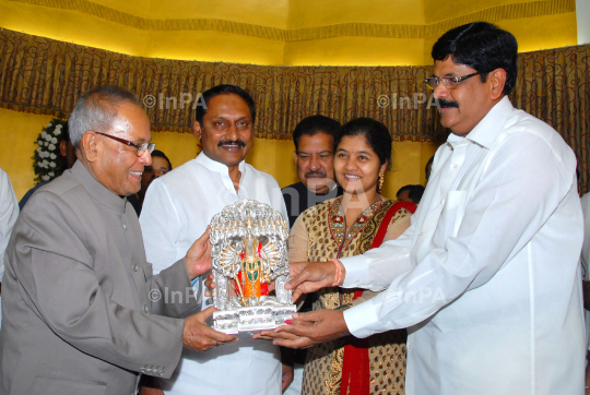 UPA nominee for President Pranab Mukherjee with N Kiran Kumar Reddy, Chief Minister of Andhra Pradesh at CLP Meeting at Jubilee Hall in Hyderabad on July, 2012. Photo Credit: Indian Photo Agency