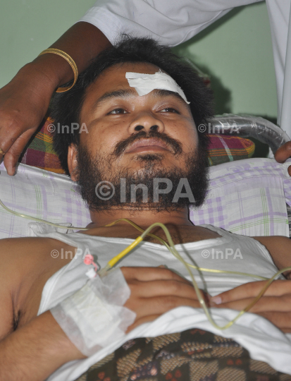Akhil Gogoi secretary of Krisak Mukti Sangram samiti (KMSS) is under going treatment at Mukanda kokati civil hospital Nalbari after he is beaten by some congress workers while he went to see the flood situtaion at Samata under Nalbari district yesterday on Saturday 7th July 2012. Photo by Dasarath Deka/Indian Photo Agency