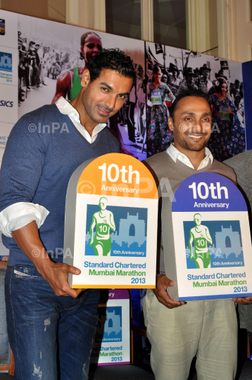 Bollywood actors Rahul Bose and John Abraham during the press conference of the Tenth Standard Chartered Mumbai Marathon 2013 in Mumbai, India on July 18, 2012. The tenth edition of the Standard Chartered Mumbai Marathon 2013 will be held on January 20, 2013. Photo by Sachin Halde/Indian Photo Agency