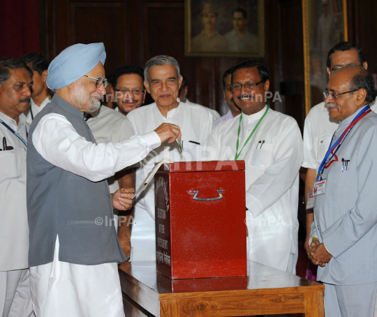 Indian Prime Minister, Dr Manmohan Singh casting his vote in the Presidential election at Parliament House, in New Delhi on July 19, 2012. Union Minister for Parliamentary Affairs and Water Resources, Pawan Kumar Bansal is also seen. Photo Credit: Indian Photo Agency