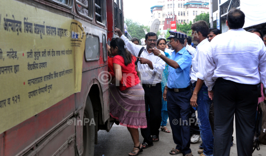 Commuters crowd for bus after a disruption in local train service during the evening rush hour in Mumbai, India, Friday, July 20, 2012. A section of motormen went on a flash strike affecting normal movement of trains. Photo by Sachin Halde/Indian Photo Agency