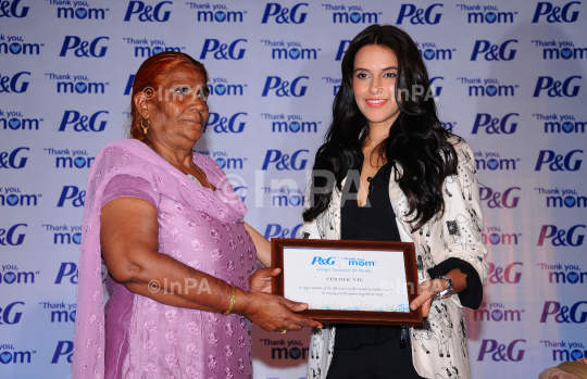 Bollywood actress Neha Dhupia felicitated to Sushila Devi at the P&G's Thank you mom event in Mumbai, India on July 21, 2012. Photo Credit: Indian Photo Agency
