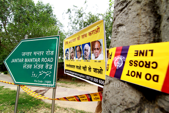 Do Not Cross Line: A poster with pictures of Prime Minister Manmohan Singh and ministers Salman Khurshid, P Chidambaram, Kapil Sibal, Sharad Pawar demanding probe by an independent Special Investigation Team during a protest of Anti-corruption activist Anna Hazare in New Delhi on July 26,2012. Three supporters of Hazare began an indefinite fast from Wednesday to pressure the government into passing a strong law against corruption. Photo by Shweta/Indian Photo Agency