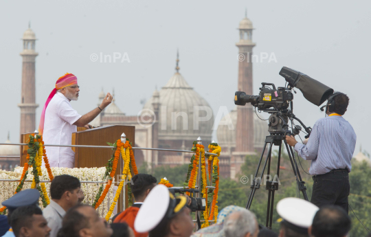 Prime Minister of India Narendra Modi speaks from the rampart of the Red Fort on 70th Independence Day of India in New Delhi, India on Aug 15, 2016. Jama Masjid is seen in background. Photo Credit: Indian Photo Agency (InPA)
