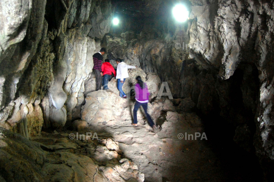 Travel: Tourists visit the famous Mawsmai cave in Cherrapunjee in Meghalaya on June 5, 2012. Cherrapunjee is a small town located on the southern edge of Khasi Hills, at an altitude of about 4823 feet (1484 m) above mean sea level. Cherrapunjee is locally and now officially known as ëSOHRAí. Khasi people of Mon-Khmer origin inhabit it. It is the headquarters of Sohra Civil Sub-Division and falls in East Khasi Hills District of the Indian State of Meghalaya. Meghalaya is one of the seven states of North East India with Assam to its North and sharing an international border with Bangladesh on its South. Photo by Luit Chaliha/Indian Photo Agency