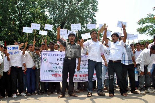 Activists All Assam Minorities Students' Union (AAMSU)blocked National highway 37 and shout slogans demanding to re-launch the registrar general of citizen registration's pilot project to update the National Register of Citizens (NRC) of 1951 in Nagaon on Wednesday, June 06, 2012. Photo by Anuwar Hazarika/Indian Photo Agency