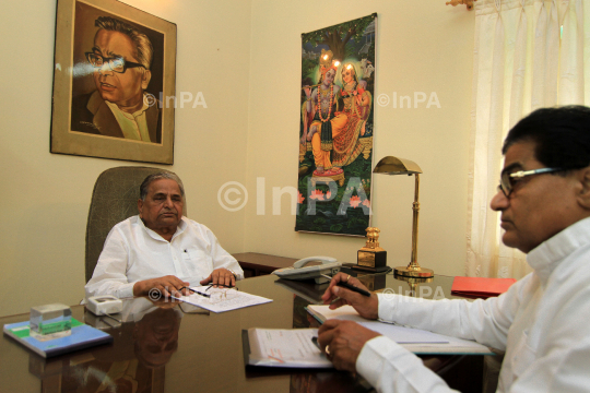 Samajwadi Party president Mulayam Singh Yadav with senior SP leader Prof. Ram Gopal Yadav during party's Parliamentary Board meeting in New Delhi on June 11, 2012. Photo Credit: Indian Photo Agency