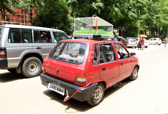 DB Sahoo in his World's First Carbon- Capture Car powered by Clean Energy in New Delhi on June 14, 2012. Photo Credit: Indian Photo Agency