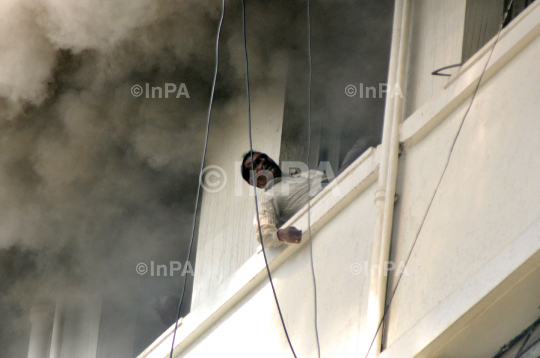 A man is trying to jump from the Maharashtra state secretariat building after a fire broke out, in Mumbai June 21, 2012. Hundreds of employees were evacuated Thursday from the seven-story government building as more than two dozen fire engines battled the major fire that raged for more than three hours in India's financial and entertainment capital. Photo Credit: Indian Photo Agency